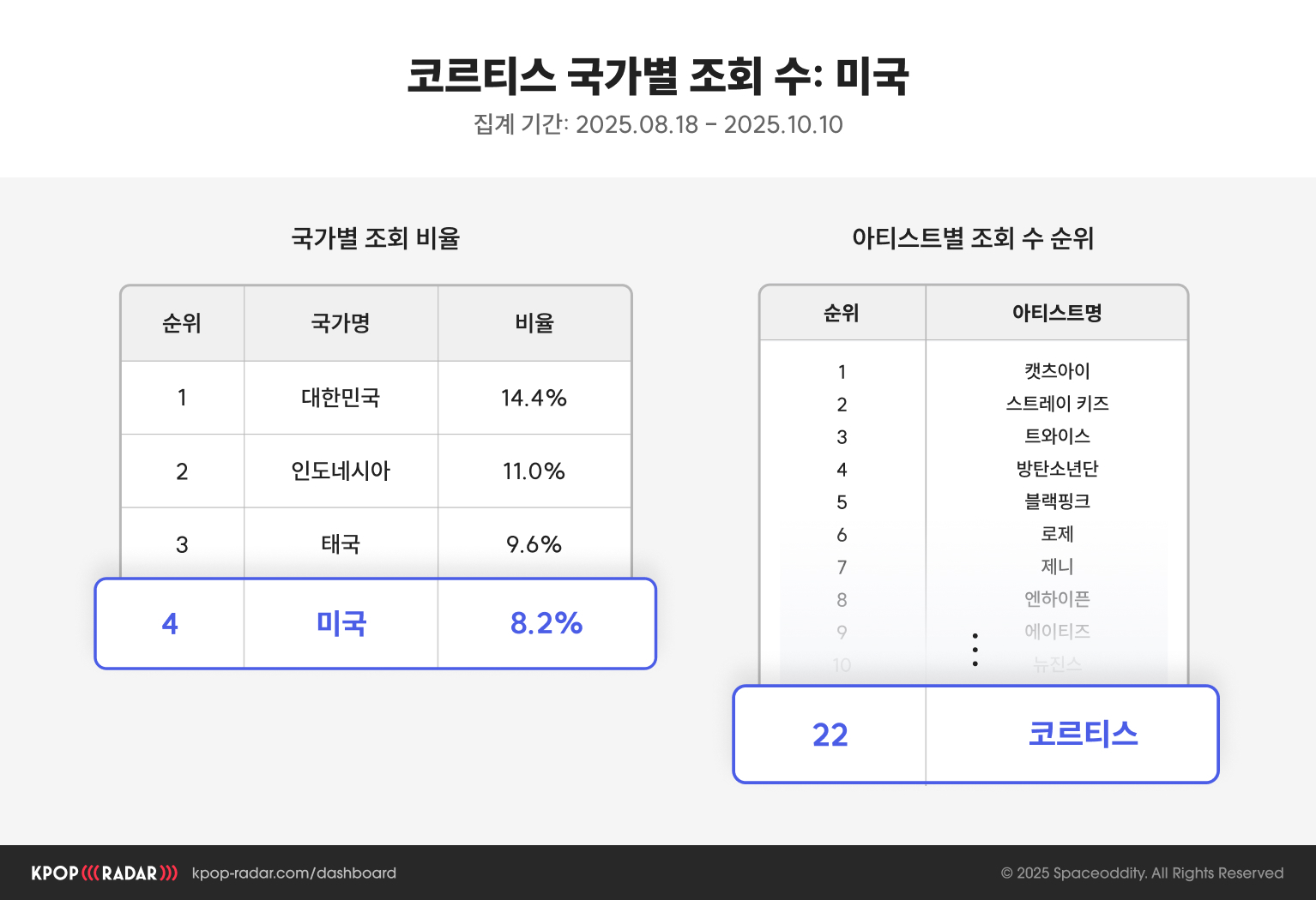 ์ง๋ 8์ 18์ผ ๋ฐ๋ท ์ดํ 10์ 10์ผ๊น์ง์ ์ ํ๋ธ ์กฐํ ์ ๊ตญ๊ฐ๋ณ ๋ฐ์ดํฐ๋ฅผ ๋ณด๋ฉด, ๋ํ๋ฏผ๊ตญ, ์ธ๋๋ค์์, ํ๊ตญ์ ์ด์ด ๋ฏธ๊ตญ์ด ์กฐํ ์ ๊ธฐ์ค 4์์ ์ฌ๋์ต๋๋ค. ์ด๋ ์ฝ๋ฅดํฐ์ค์ ์ฝํ