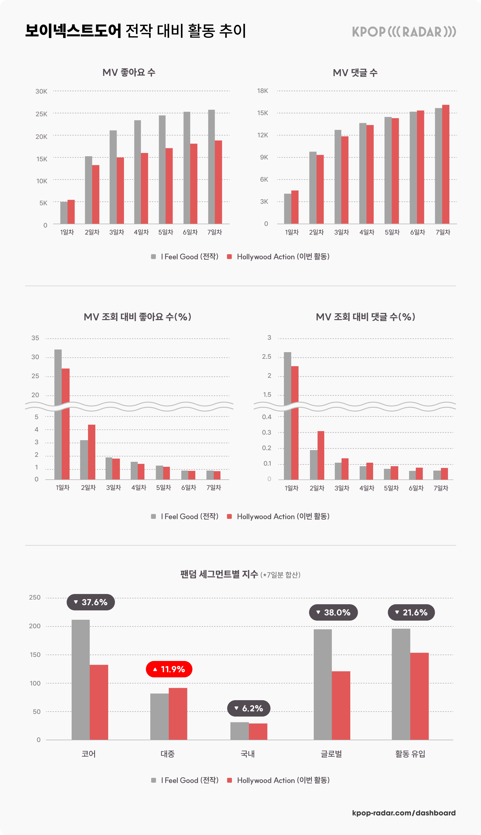 10์ 20์ผ์ ์ปด๋ฐฑํ ๋ณด์ด๋ฅ์คํธ๋์ด์ ์ ์ <Hollywood Action>์ ์ ์ <I Feel Good>์ ๋นํด ์ข์์ ์๋ ์ค์์ง๋ง, ๋๊ธ ์๋ ํฐ ๋ณ๋ ์์ด ์์ ์ ์ผ๋ก ์ ์ง๋์์ต๋๋ค.